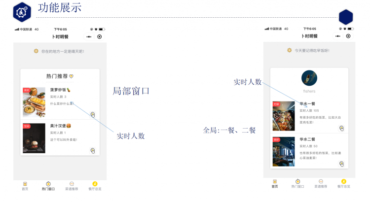 展示餐廳、熱門窗口實時人數,菜譜推薦。