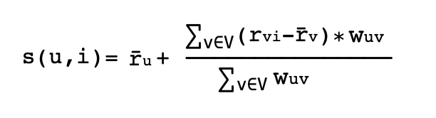 這裏給非個性化協同過濾(不包含活躍用戶的喜歡、不喜歡、以及歷史評分),返回一個以用戶U和物品I作為輸入參數的分數。該函數輸出一個分數,用於量化用戶U喜歡 / 偏愛物品I的程度。這通常是通過對與用戶相似的人的評分來完成的。涉及的公式如下: