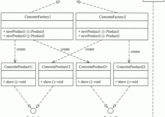 class ConcreteFactory1 implements AbstractFactory { public Product1 newProduct1() { System.out.println("具體工廠 1 生成-->具體產品 11..."); return new ConcreteProduct11(); } public Product2 newProduct2() { System.out.println("具體工廠 1 生成-->具體產品 21..."); return new ConcreteProduct21(); } }