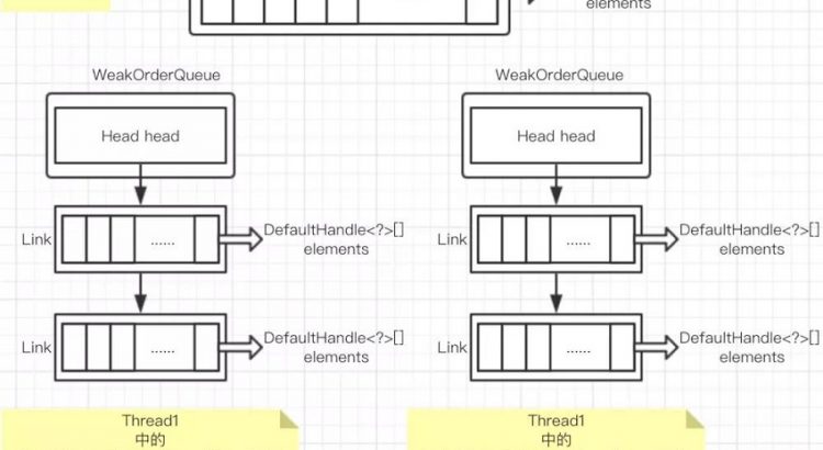 每一個線程對象包含一個 Map<Stack<?>, WeakOrderQueue>,存儲着為其他線程創建的 WeakOrderQueue 對象,WeakOrderQueue 對象中存儲一個以 Head 為首的 Link 數組,每個 Link 對象中存儲一個 DefaultHandle[] 數組,用於存放回收對象。