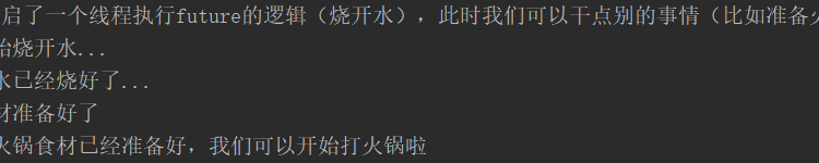 System.out.println(Thread.currentThread().getName() + ":" + " 此時開啟了一個線程執行future的邏輯(燒開水),此時我們可以干點別的事情(比如準備火鍋食材)...");