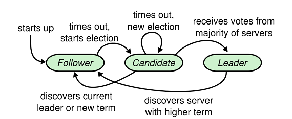 正常工作過程中,Raft分為兩部分,首先是leader選舉過程,然後在選舉出來的leader基礎上進行正常操作,比如日誌複製操作等。